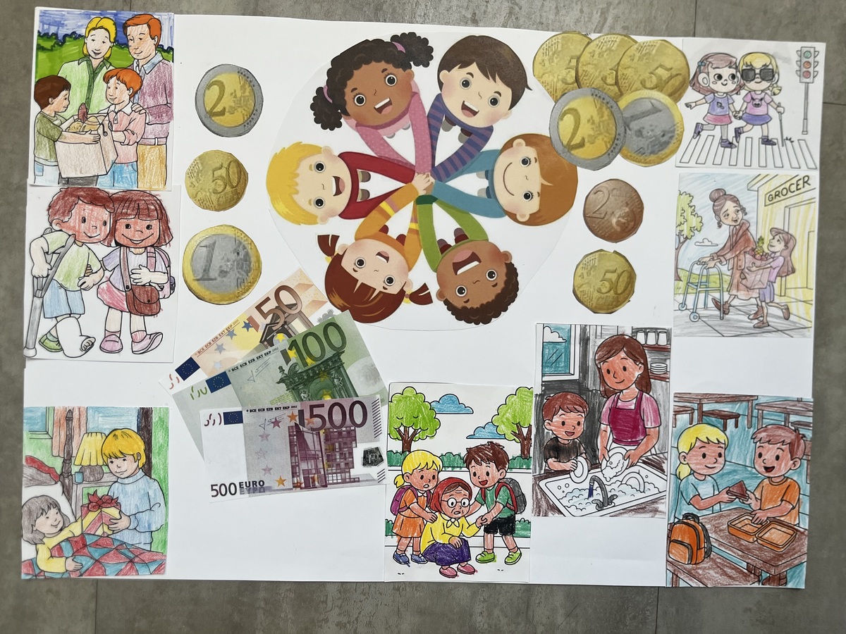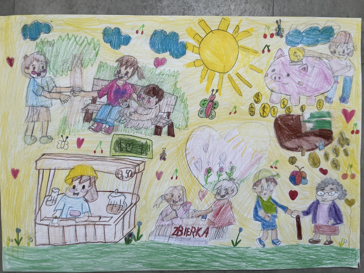 - súťažná práca: Deti vyrobili obrázky, na ktorých pomáhajú iným. Svojimi obrázkami chceli vyjadriť, že nie len peniaze nás robia bohatými, ale aj dobré skutky, kamaráti a pomoc iným.